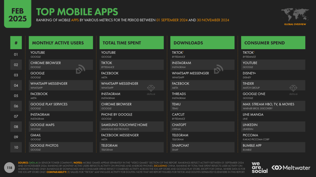 As redes sociais consolidaram-se como plataformas centrais de interação e consumo de conteúdo, com 5,24 mil milhões de utilizadores em 2025, totalizando 63,9% da população mundial. Este crescimento de 4,1% face ao ano anterior traduz-se em 206 milhões de novos utilizadores. Embora o ritmo de crescimento esteja a abrandar, indicando uma maturidade do mercado, a influência das redes sociais permanece robusta, especialmente entre os jovens dos 16 aos 34 anos.