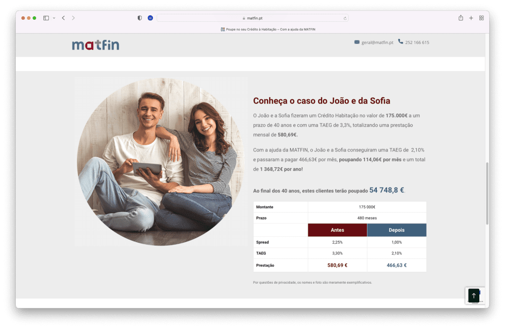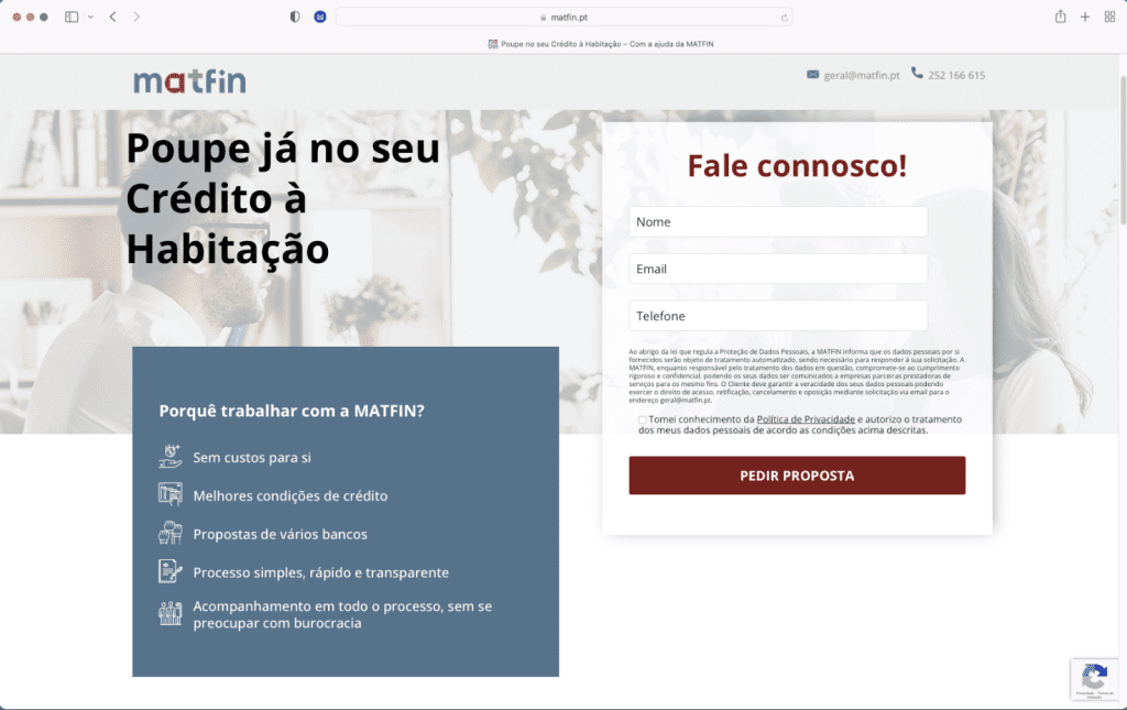 A Landing Page desenvolvida para comunicar o serviço de intermediação de Crédito à Habitação para a MATFIN é simples, direta e user-friendly: o cliente encontra rapidamente resposta às suas questões e cria uma relação de confiança com a empresa. O simulador ajuda a compreender o impacto que o serviço pode ter na sua vida financeira de forma mais tangível.